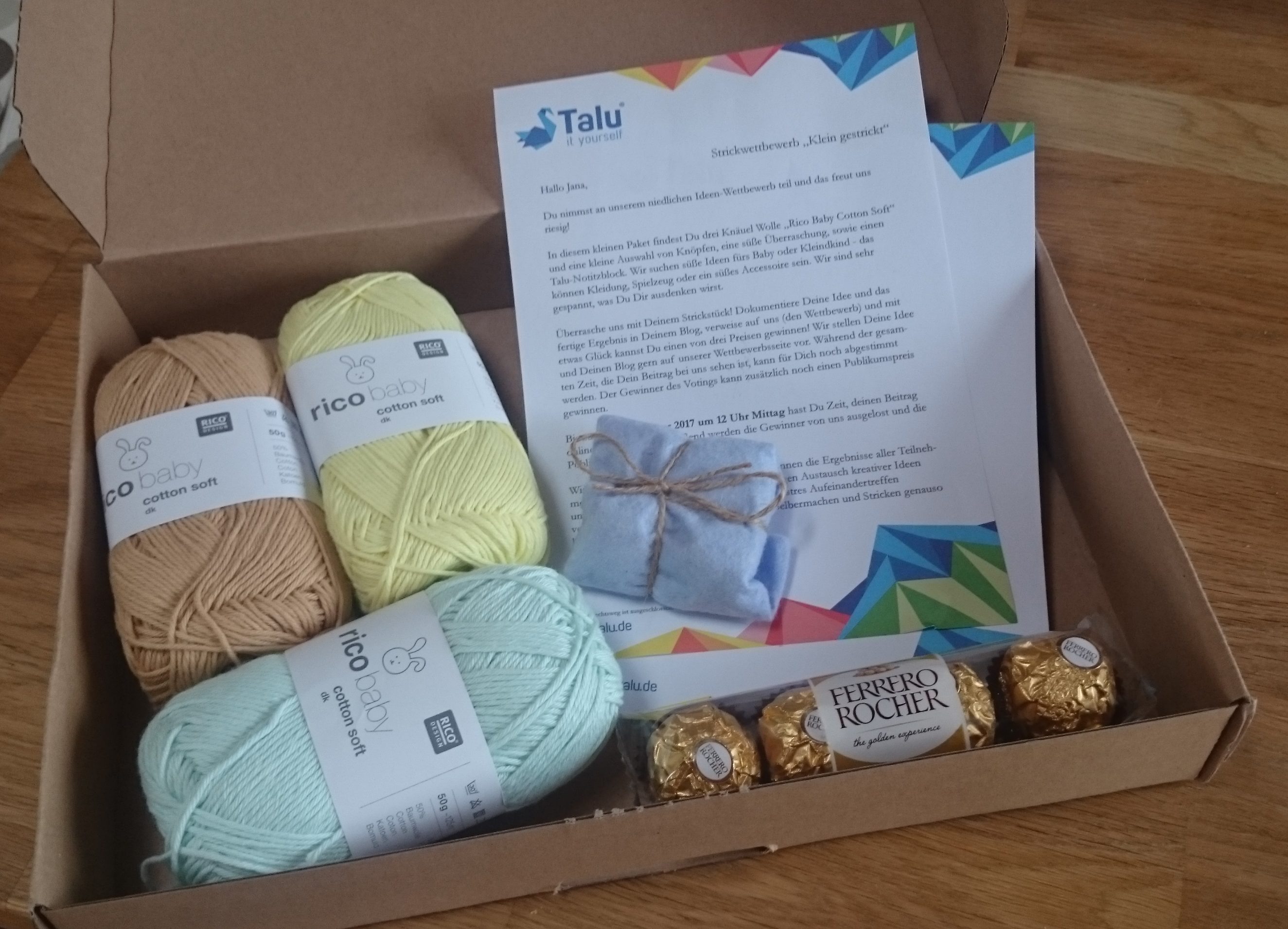 Talu schickt euch ein kostenloses Paket mit Wolle, Knöpfen und einer kleinen Überraschung. Heute habe ich meins bekommen: