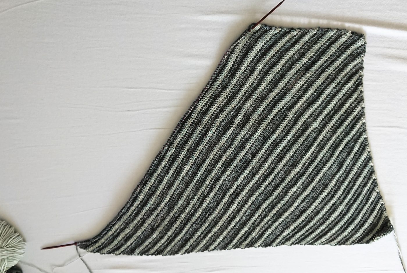 Die Grundanleitung ist die gleiche. Allerdings habe ich im Abstand von 3 Streifen (nur die dunklen) verkürzte Reihen eingestrickt.