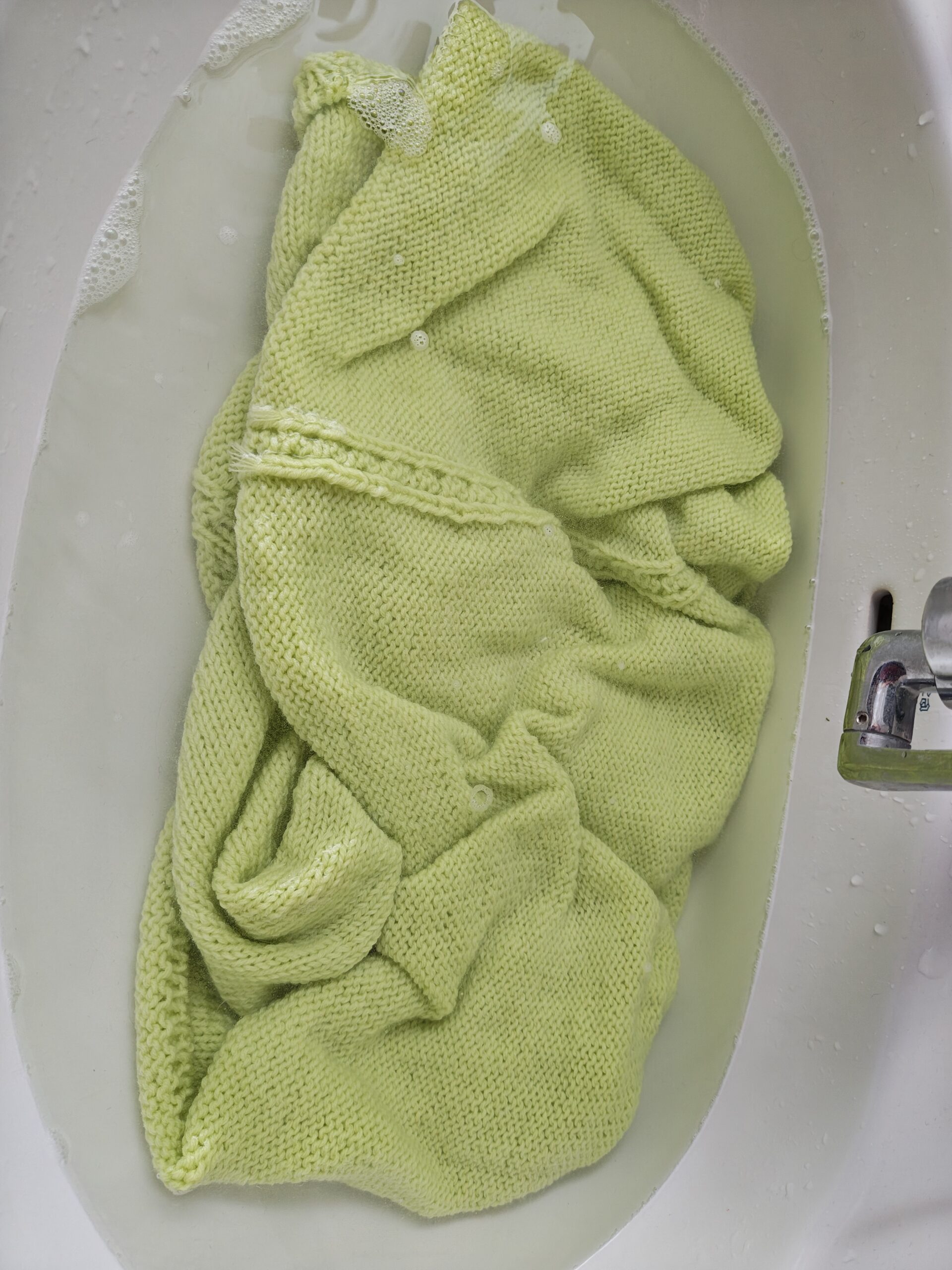 - Strickstück einweichen. Ich mache das direkt im Waschbecken mit lauwarmen Wasser und etwas flüssigem Waschmittel.