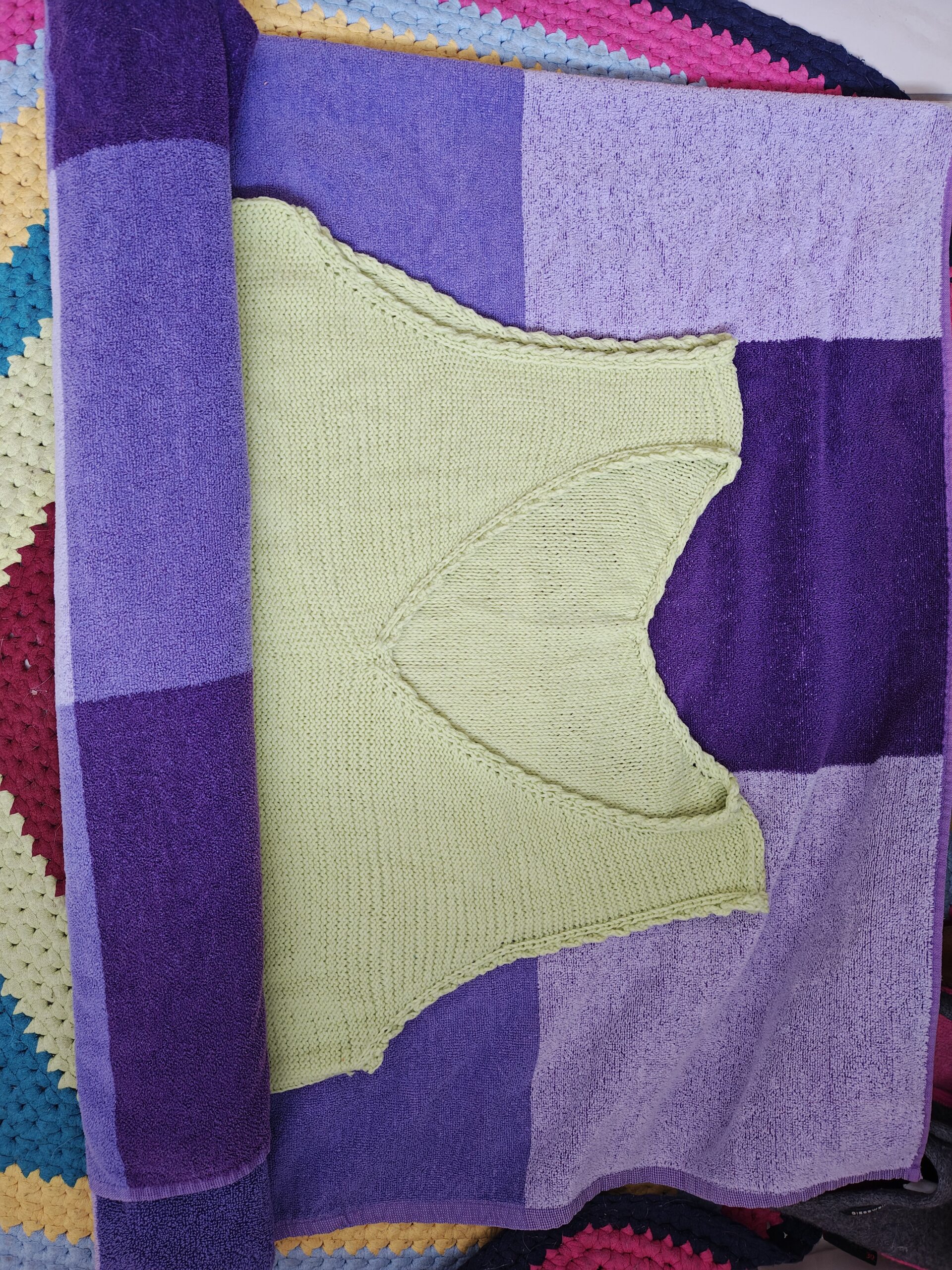 - Verbesserung der Form und Größe: Das nasse Gestrick kann in die gewünschte Form und Größe gezogen und fixiert werden. So kann man zum Beispiel zu kurze Ärmel leicht verlängern.