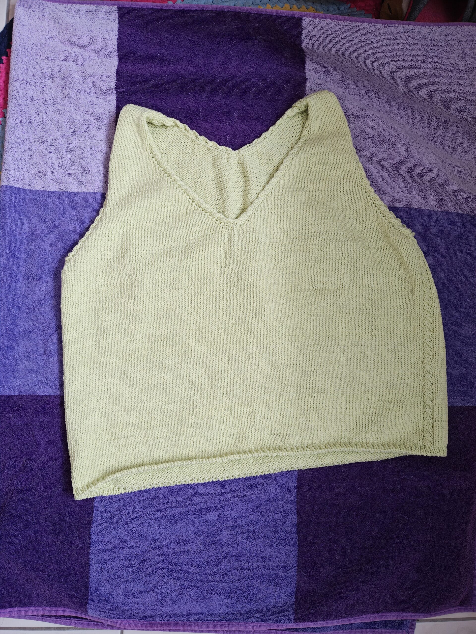 Das Ergebnis danach überzeugt mich immer wieder. Die Maschen sind viel gleichmäßiger. Die Träger des Shirts und das Bündchen rollen sich nicht mehr ein. Ich habe durch leichtes Ziehen in Länge und Breite die Form erreicht, die ich am besten passt.